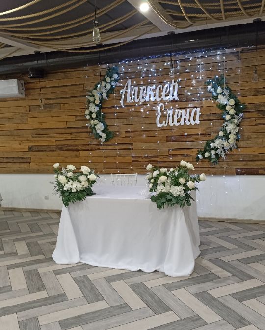 2 композиции (полукруг) из искусственных цветов и зелени на стену за столом молодоженов (аренда) – 4800 руб.